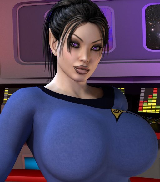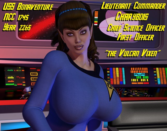 | Physical Description | Charybdis (Kaar-ib-dis) is exceptionally curvaceous- a rare attribute amongst Vulcanoids, to be certain, and her figure is a fetching hourglass. Busty with a small waist, broad hips and a plush rounded posterior, her attributes are somewhat toned down in the military cut uniform of the modern era. Rather tall, she stands nearly six feet in standard Starfleet-issue duty boots, and wears her hair down but pulled back, clearly showing her widow's peak while her curly hair cascades in ringlets down her back, free and loose, though it is within Starfleet regulation. She has grown it our from when her bangs matched her sharply angled eyebrows, rather than the traditional Vulcan 'bowl cut'. Violet eyes that appear to be not unlike a nebulae surrounding her pupils, that are both unusual and striking- a family trait, while her skin tone is medium Caucasian with a slightly greenish tinge to it, which intensifies to a sage color when she is excited or mint when embarrassed. Born in the year 2237 in the city of Dartha, Romulus. |